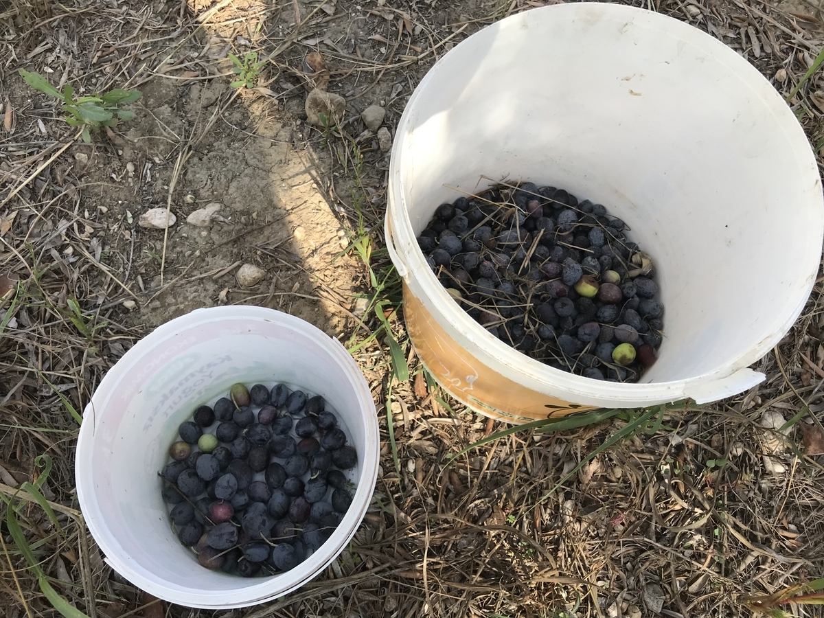 少しずつ集めた地面に落ちたオリーブが100kgを超えただろうということで